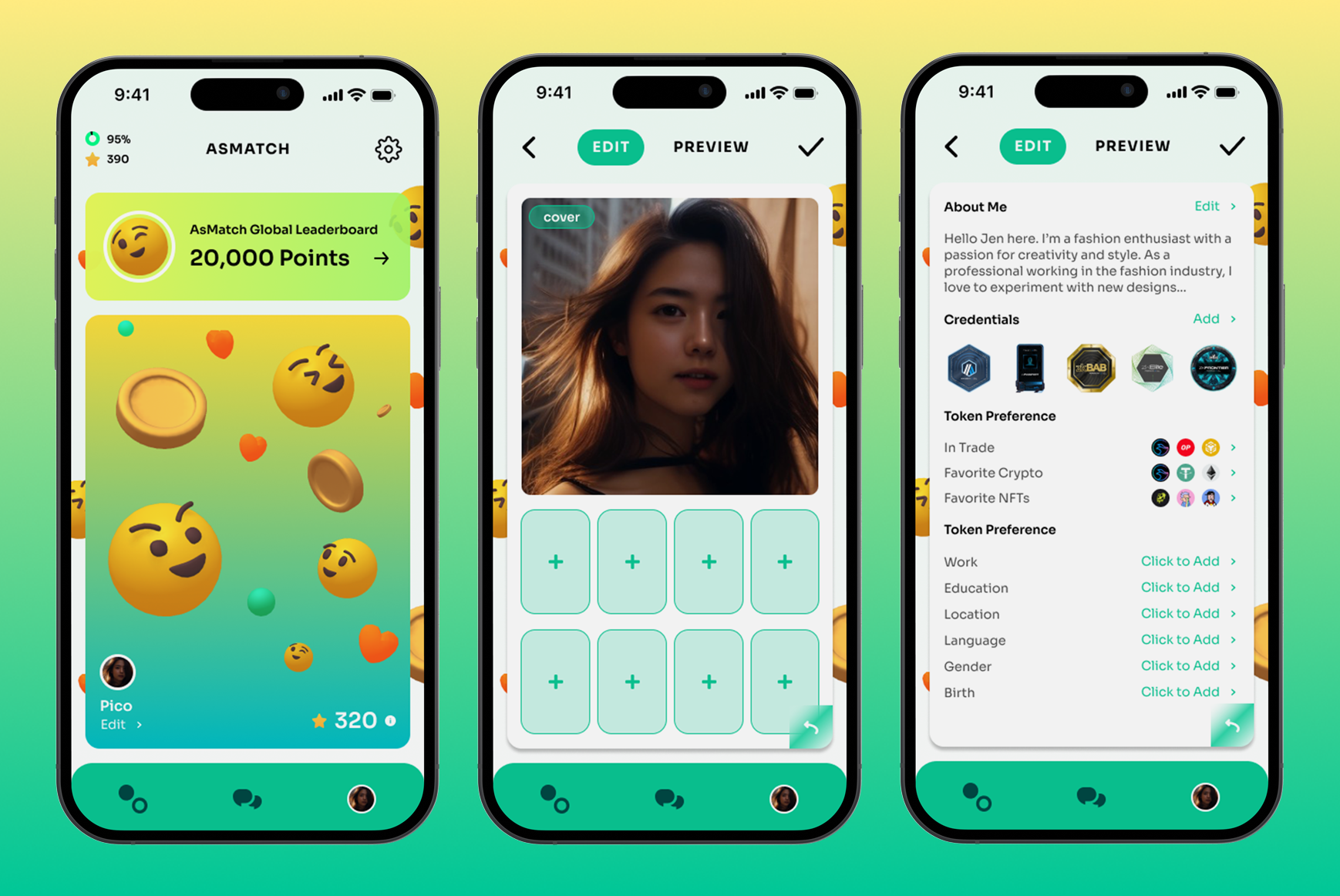 **Card back:** Provide essential details, including your personal introduction, token preference, employment, educational background, location, language, and more.