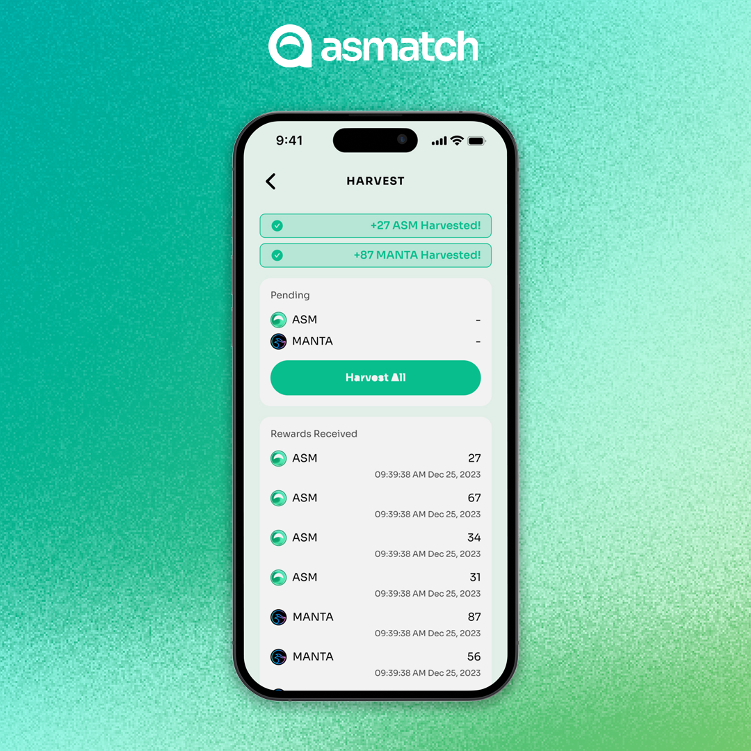 3. Confirm by pressing 'Stake'. To view your yield, tap 'Harvest' in your chosen pool, and select 'Harvest All' to add the yield to your AsMatch Wallet balance. You can harvest at any time, and your harvest will be settled within 1 hour.
